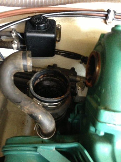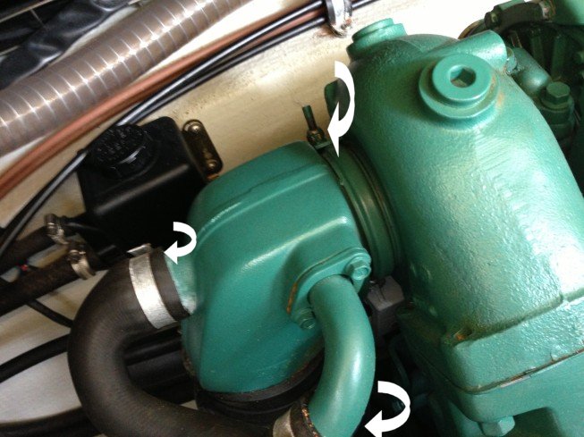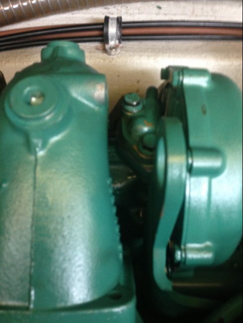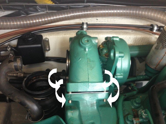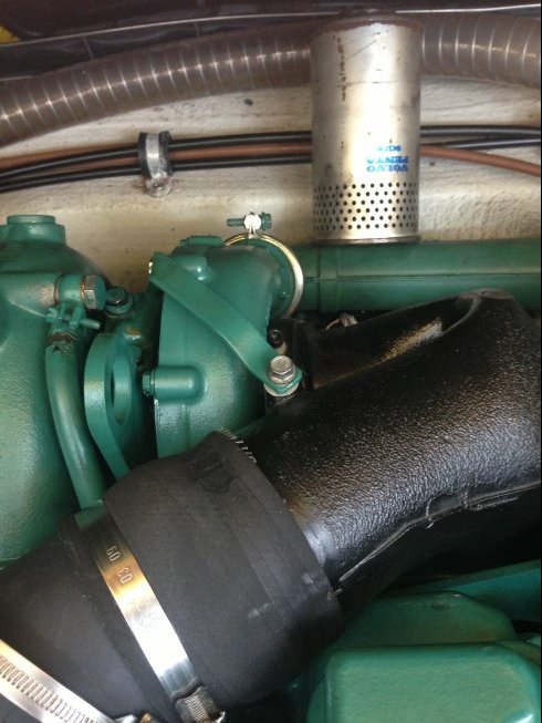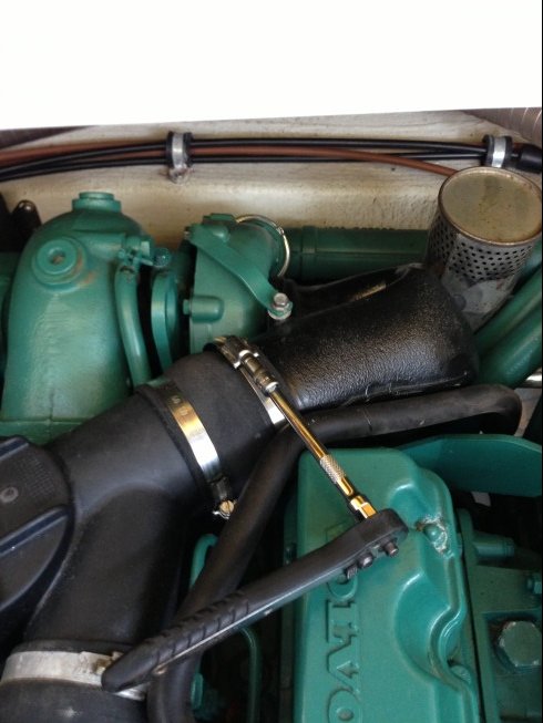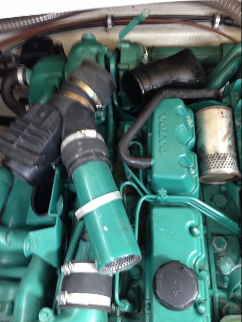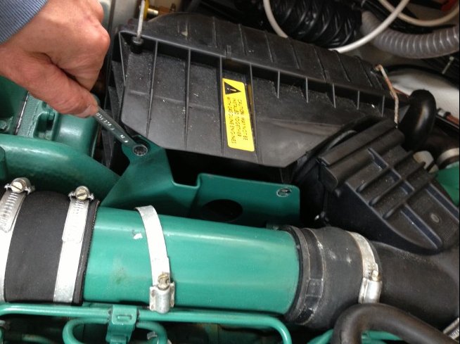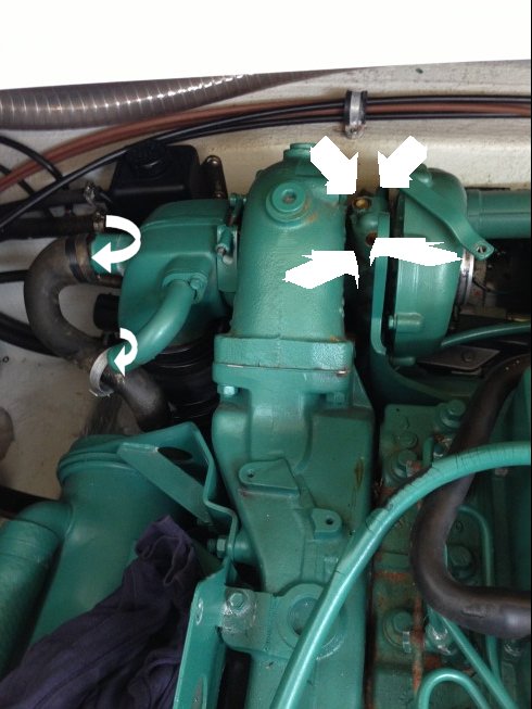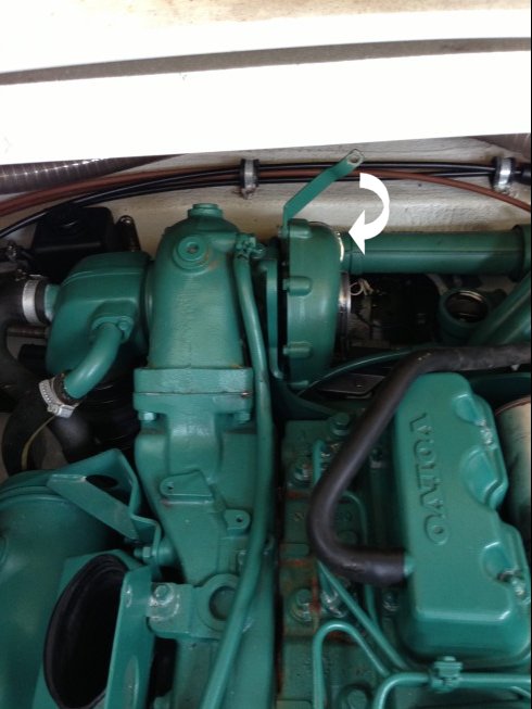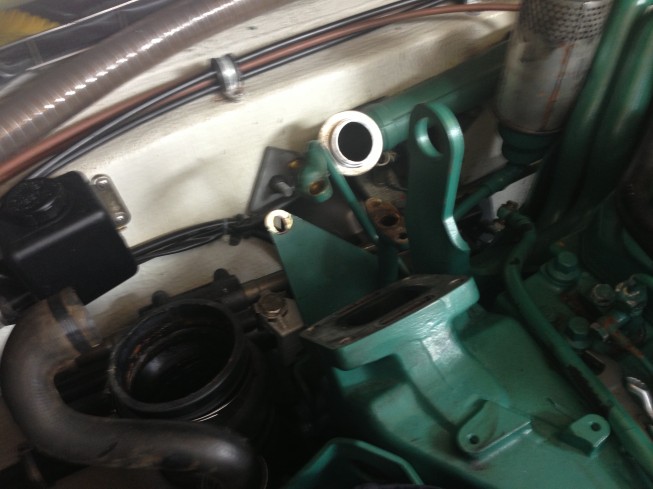 Remove the exhaust hook. Put an old t-shirt in the hole so nothing falls down here. If this happens, the boat must go ashore. | I didn't get a good picture of what is now going to be dismantled. If you follow the oil pipe that is at the top of the turbo down the block, you will come to a clip under the turbo. This should be loosened, not removed. Follow the pipe further down to about the middle of the block. Here it mentions a 19mm banjo bolt that must be removed so that the oil pipe on top of the turbo can be moved away when the turbo is to be removed. DO NOT bend the oilpipes. | |