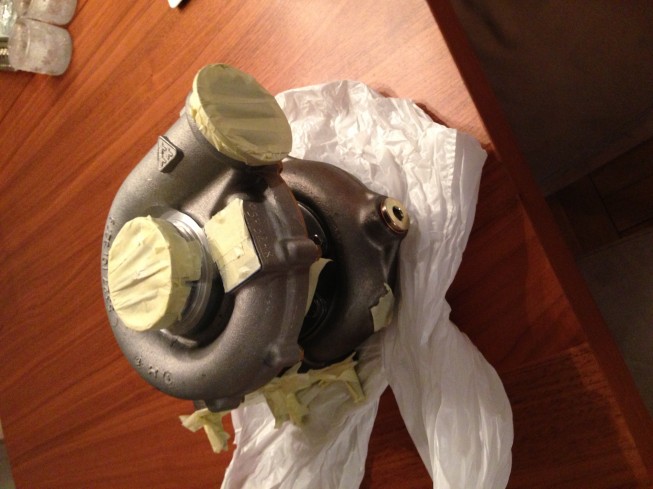 Wipe up any oil spills around where you have screwed on pipes that have to do with oil (the one on the side of the block and the 2 on the turbo). Wait a bit so the air has time to rise to the expansion tank (5 minutes??) and you can start up the engine. Let it run for a few minutes. Stop it again. Check the engine for oil leaks and water leaks. Check especially the banjo bolt on the block on the left side and under the oil pipes to the turbo.