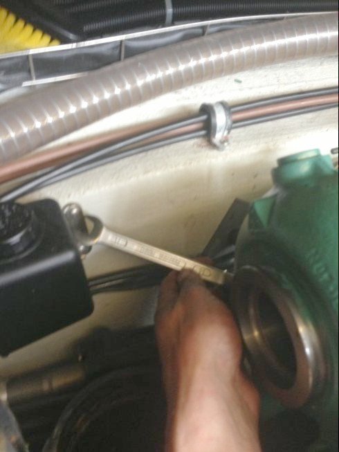 We need some parts from the old turbo to be transferred to the new one. Remove the Allen screw from the new turbo as shown in the picture. Loosen the bolt on the old turbo and transfer to the new one. This is the rear attachment to the turbo. Also move over the brass bolt from the old one to the new one (the bolt next to the wrench picture). | ||