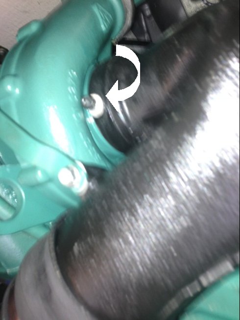 | Attach the clamp after the turbo as shown in the picture. | So: now comes the tricky part. Fit the banjo screw for the oil pipe. Here, 2 new copper washers must be fitted, at the same time that you must attach the pipe. It took me almost 10 whole minutes before it finally sat as it should. I used a socket wrench that I filled with cardboard to get some pressure on the bolt. Works fine. | |