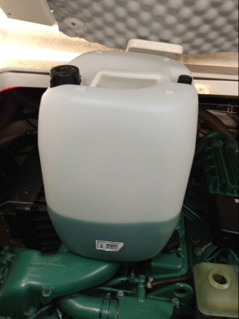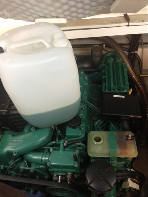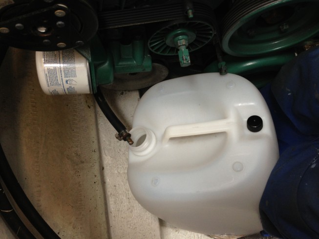 Drain the engine internal coolingsystem | Drain the engine of coolant. On the left side of the engine there are 2 hoses. We will loosen the one that is NOT marked with blue strips. Empty the contents into a jug. If it looks bad (not green and nice), then change the antifreeze. Drain as much as possible. The jug you see here is a 20 liter Biltema jug |